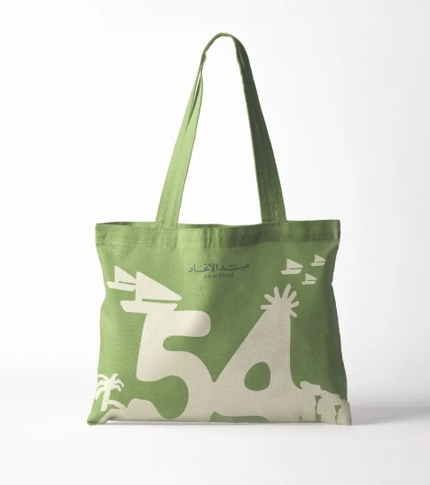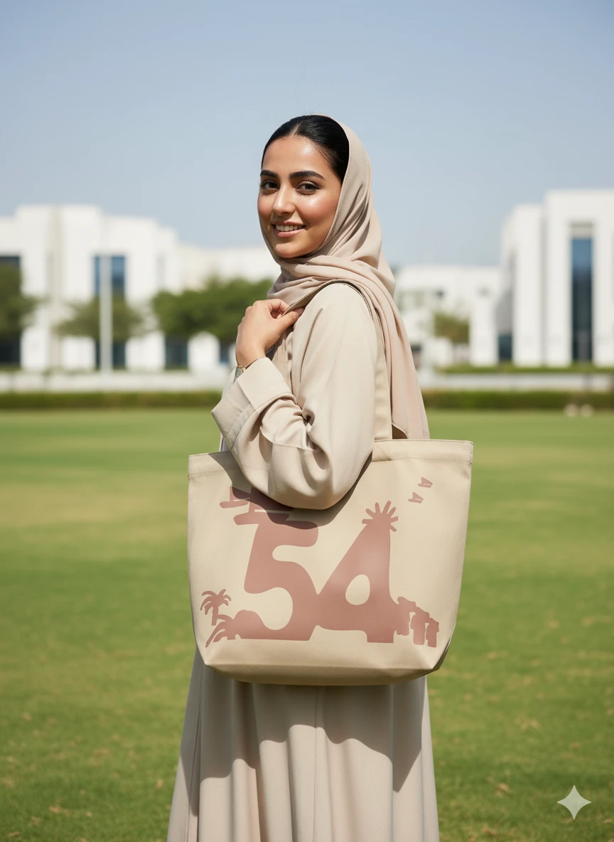 حقيبة أنيقة مصنوعة من قماش عالي الجودة باللون البيج الفاتح، تحمل تصميمًا مميزًا مستوحى من شعار اليوم الوطني الإماراتي الرابع والخمسين (54)، حيث يجسد الرقم بخط عصري يدمج رموز الهوية الإماراتية مثل النخلة، الصقر، والرمال بشكل فني راقٍ.