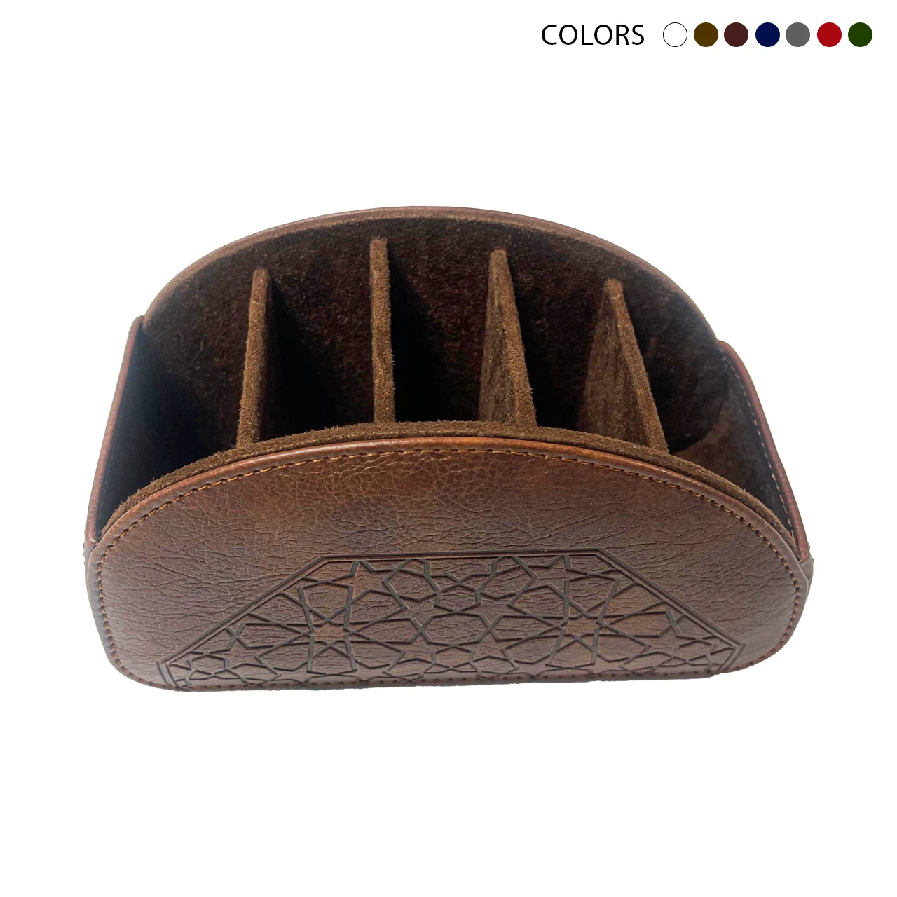 حافظ على ترتيب المساحات مع حامل أجهزة تحكم جلدي ومنظم مكتب متعدد الأقسام. يتميز الجراب الجلدي المزخرف بلمسة ناعمة وتصميم رمادي مزخرف مع خيارات ألوان، ويوفر أقساماً منفصلة لتخزين أجهزة التحكم عن بُعد، النظارات، الأقلام، الهواتف الذكية والمقتنيات الصغيرة، مناسب كمنظم مكتب وجراب تخزين مزخرف.