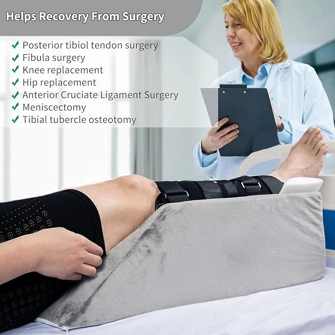 وسادة إسفينية فخمة طبية مصممة لرفع الساق وتوفير دعم مريح أثناء التعافي الطبي وسادة للتعافي الطبي مناسبة كوسادة رفع الساق ووسادة للساق ووسادة بعد الجراحة ووسادة للإصابات لتقليل التورم وتحسين الدورة الدموية وتخفيف الألم النواة من الفوم والغطاء الناعم يوفران دعما للركبة والكاحل أثناء الراحة سواء على السرير أو على كرسي مائل تصميم متين ومريح لضمان استخدام طويل الأمد ويساعد على نوم أكثر راحة أثناء فترة التعافي