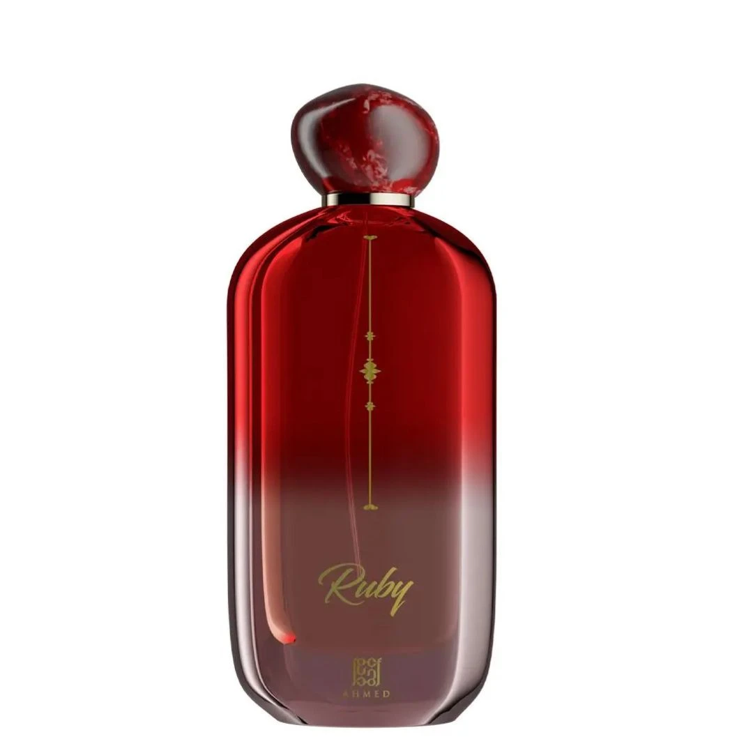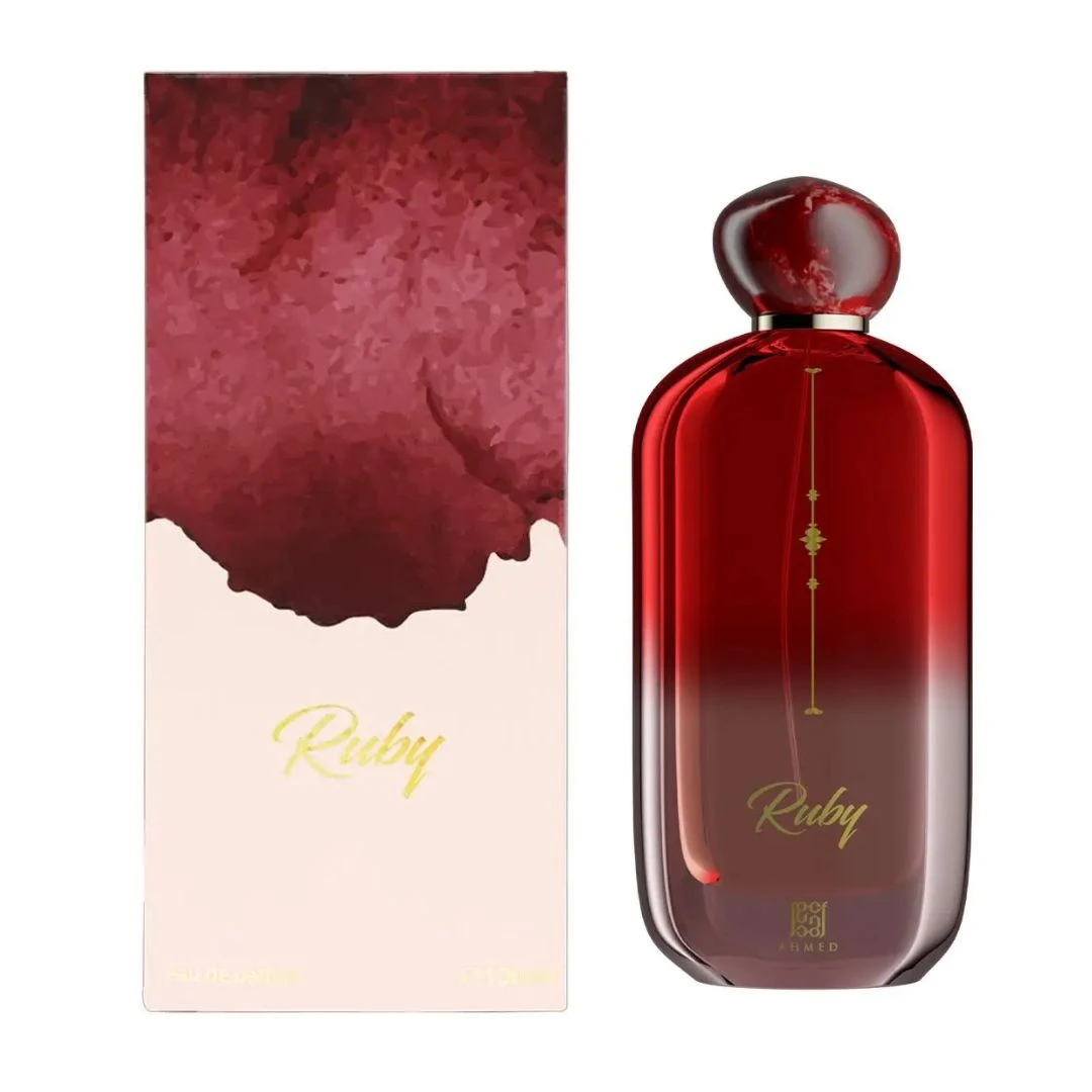 روبي أو دو بارفان ١٠٠ مل من أحمد المغربي هو عطر حمضي زهري متألق للنساء. يفتتح بمسحات من البرتقال الصقلي والياسمين والليلي والتفاح المنعش؛ يكشف قلبه عن تناغم بودري ناعم مدموج بحبوب الفانيلا ونفحات البحر، وتستقر قاعدته على مزيج حسي من المسك والكشميران وخشب الصندل والأمبروكسان. تتضمن تركيبته حبوب الفانيلا للاستخلاص ومستخلص الفانيلا من حبوب الفانيلا لمنح دفء حريري.